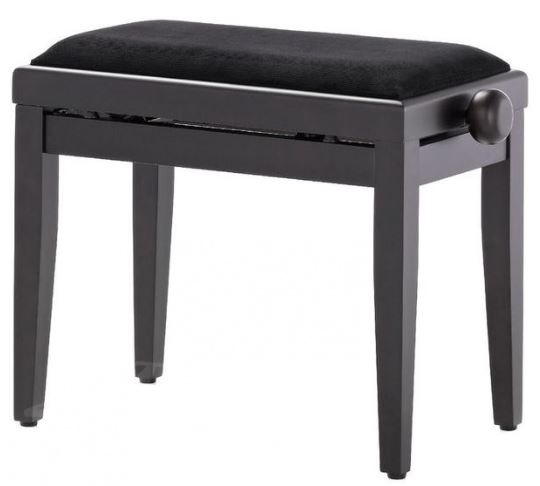 Klavírní stolička Thomann KB 15 RM s nastavitelnou výškou sedáku v rozmezí 48 - 56 mm. Díky kvalitnímu, sametovému polstrování sedáku je stolička i při dlouhém hraní velmi pohodlná. Elegantní vzhled zajišťuje povrchová úprava v matném, černém provedení.