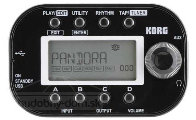 Multiefekt Korg Pandora mini se připojuje k aparatuře pomocí standardního 1/4" jack výstupu. Mobilitu přístroje ještě podtrhuje možnost hry do sluchátek.